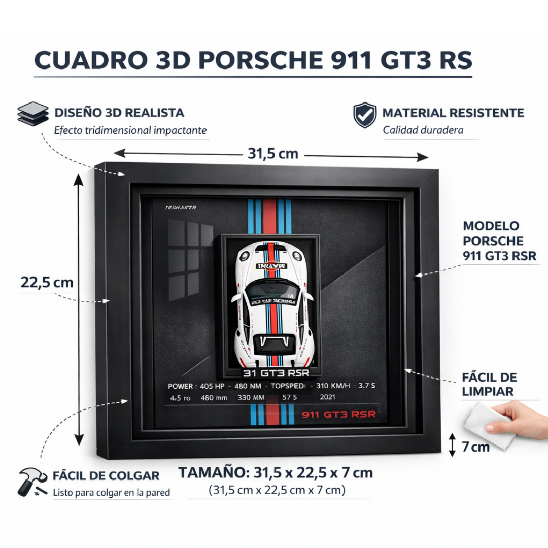 Haz que tu pared deje de verse vacía y transmita estilo, ambición y personalidad. Este cuadro 3D inspirado en el Porsche 911 GT3 es el detalle perfecto para elevar tu setup, oficina o habitación al instante.